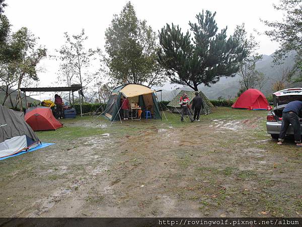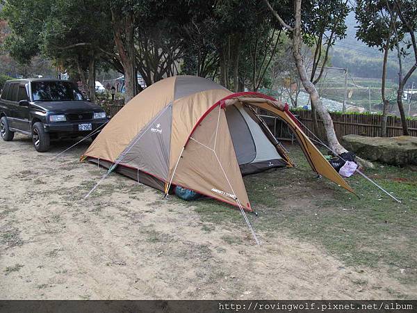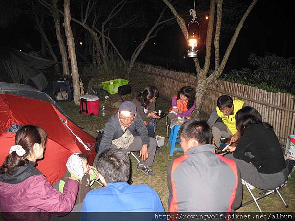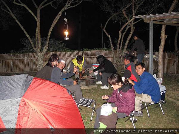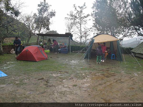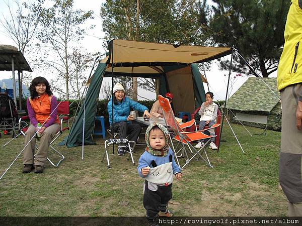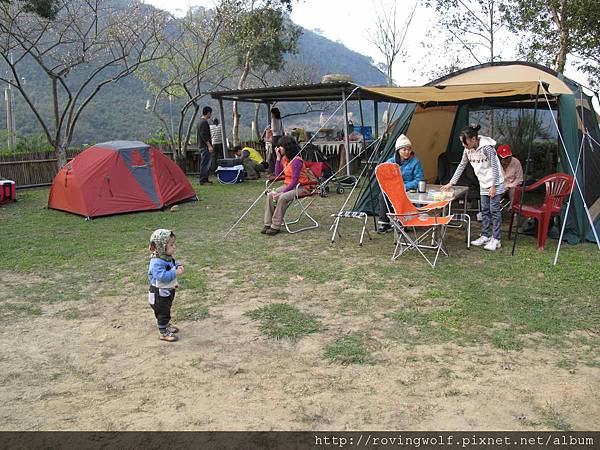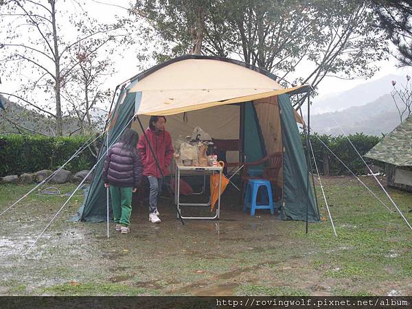 背後是我們家的新裝備:"客廳帳",後來下雨它可是發揮不小的功能,第一次的就遇到考驗,性能還不差,但是對這群人來說還是太小了。
