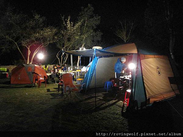 回到營地,天色漸暗,準備晚上的烤肉大餐囉!我則開始架設燈具,三盞燈都用上了