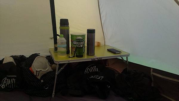 這小方桌在迪卡儂買的,一張459元,本來買來準備用在戶外簡單泡個茶或咖啡。沒想到變成這種用處,在帳篷內擺在角落很剛好,不佔空間。