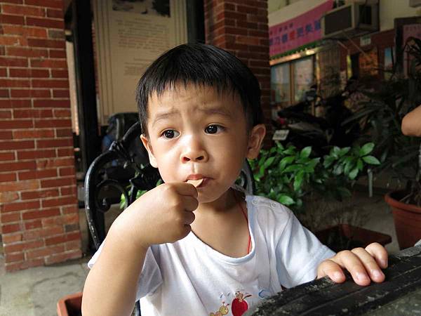 外婆的鬆餅有蜂蜜,有甜吃,洋洋就可以乖乖坐好,看他連湯匙都快吞下去了!
